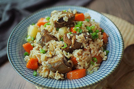 9.把烧开的排骨连同水一起倒进电饭煲里,2杯米放入2杯半的水,水位不够加开水